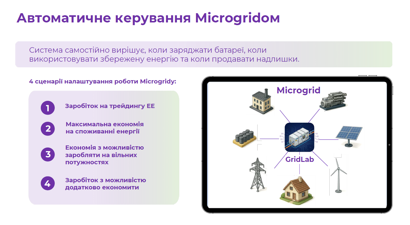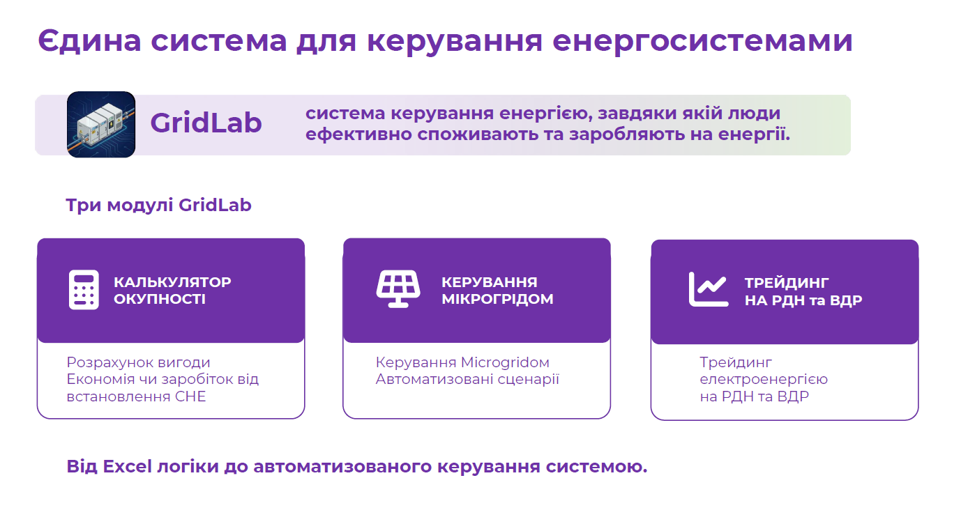 - Універсальність. GridLab EMS здатна приєднатись до будь-якого обладнання.