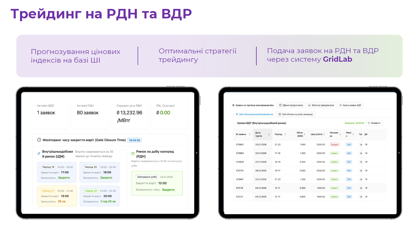 - Інтеграція з ринком (РДН та ВДР). Система аналізує ціни на електроенергію та автоматично обирає оптимальні періоди для заряду та розряду.